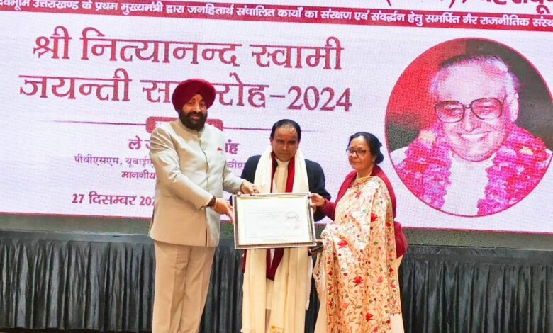 प्रदेश के प्रथम मुख्यमंत्री नित्यानंद स्वामी जी की 96वीं जयंती के अवसर आज राजभवन में नित्यानंद स्वामी जनसेवा समिति द्वारा एक भव्य कार्यक्रम का आयोजन किया गया। जिसमें प्रदेश के राज्यपाल लेफ्टिनेंट जनरल (से.नि.) गुरमीत सिंह बतौर मुख्य अतिथि सम्मिलित हुये। इस विशेष कार्यक्रम में नित्यानंद स्वामी जनसेवा समिति द्वारा विभिन्न क्षेत्रों में अपना अमूल्य योगदान देने वाले महानुभावों को सम्मानित किया गया। इस अवसर पर समिति द्वारा प्रदेश के युवा कैबिनेट मंत्री डॉ. धन सिंह रावत को उनकी साफ-सुथरी राजनीतिक छवि के लिये उन्हें ‘‘स्वच्छ राजनीतिज्ञ सम्मान’’ से सम्मानित किया गया। जिसे उन्होंने राज्यपाल के हाथों ग्रहण किया। सम्मान समारोह को सम्बोधित करते हुये डॉ. रावत ने कहा कि “नित्यानंद स्वामी के आदर्श और समाज सेवा के प्रति उनका समर्पण हम सभी के लिए प्रेरणा स्रोत है। यह सम्मान मुझे समाज और प्रदेश की भलाई के लिए और अधिक निष्ठा और समर्पण के साथ कार्य करने के लिए प्रेरित करेगा।“ उन्होंने कहा कि नित्यानंद स्वामी छात्र राजनीति से उभरे हुये राजनेता थे। उनका जीवन संघर्षों से भरा रहा। वह प्रदेश के ऐसे राजनेता थे जो जनहितैषी और उदार छवि के थे, सादगी, कर्तव्यनिष्ठा और ईमानदारी के कारण उनका सम्मान पक्ष और विपक्ष के सभी लोग किया करते थे। डॉ. रावत ने कहा कि हमें स्वामी जी के पद चिन्हों पर चल कर राजनीतिक सुचिता के साथ जनसेवा करना चाहिये, यहीं उन्हें सच्ची श्रद्धांजलि होगी। डॉ. रावत ने इस सम्मान के लिए नित्यानंद स्वामी जनसेवा समिति का आभार व्यक्त करते हुए, इस सम्मान को समाज सेवा के प्रति अपनी प्रतिबद्धता का प्रतीक बताया। इस अवसर पर नित्यानंद स्वामी जनसेवा समिति के पदाधिकारी अन्य गणमान्य लोग उपस्थित रहे।