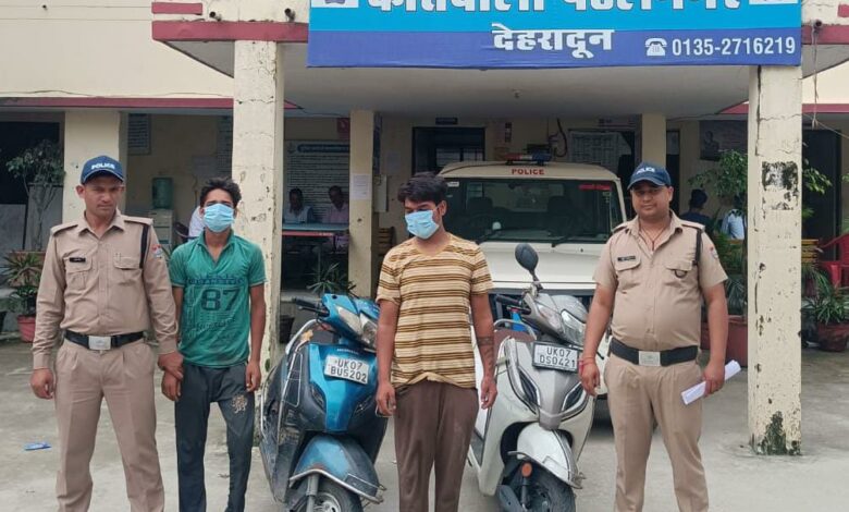 थाना पटेलनगर में दो लोगों ने अपनी-अपनी स्कूटी एक्टिवा किसी अज्ञात व्यक्ति के चोरी होने के सम्बन्ध मे लिखित प्रार्थना पत्र दिए। जिस पर पुलिस ने अज्ञात के खिलाफ चोरी का मुकदमा दर्ज किया। प्रभारी निरीक्षक कोतवाली पटेलनगर ने चोरी के खुलासे के लिए थाना स्तर पर पुलिस टीम गठित की। गठित पुलिस टीम ने पीड़ित व्यक्तियो से घटना के संबंध में जानकारी प्राप्त करते हुऐ घटनास्थल व आने जाने वाले मार्गों में लगे सीसीटीवी कैमरो को चैक किया गया। गत 9 सितम्बर को पुलिस टीम ने मुखबिर की सूचना पर घटना के शामिल रोहित क्षेत्री पुत्र भगत बहादुर क्षेत्री व शुभम मलहोत्रा पुत्र धर्म सिंह को सॉलिटेयर हाइट अपार्टमेंट के पास खाली ग्रांउड पटेलनगर से चोरी की वाहन संख्या- यूके 07 बीयू 5202 स्कूटी एक्टिवा व यूके 07 डीएस 0421 स्कूटी एक्टिवा 2 स्कूटियो के साथ गिरफ्तार किया गया।