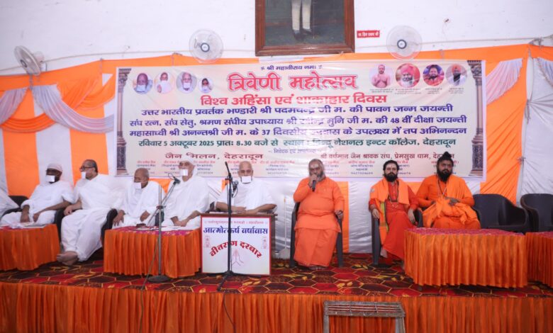 देहरादून। हिंदू नेशनल इंटर कॉलेज देहरादून में जैन मिलन देहरादून एवं श्री वर्धमान जैन श्रावक संघ के तत्वावधान में त्रिवेणी महोत्सव का आयोजन किया गया। अंतर्राष्ट्रीय अहिंसा दिवस के इस अवसर पर अहिंसा दिवस कार्यक्रम के साथ उपाध्याय रविंद्र मुनि जी महाराज का 48 वा दीक्षा दिवस, आचार्य पदम चंद्र जी महाराज की जन्म जयंती तथा महासाध्वी अनंत श्री जी महाराज की 37 दिवसीय उपवास तपस्या को बहुत हर्षोल्लास के साथ बनाया गया कार्यक्रम में मुख्य अतिथि तुलाज ग्रुप के अध्यक्ष सुनील कुमार जैन रहे तथा सभाअध्यक्ष लोकेश जैन थे। ध्वजारोहण शकुंतला जैन द्वारा किया गया। कार्यक्रम का शुभारंभ पूज्य उपाध्याय रविंद्र मुनि जी महाराज द्वारा मंगलाचरण कर किया गया। कार्यक्रम में ज्योतिष दिवाकर श्री राजेश मुनि जी महाराज सहित रिधिमा जी महाराज, टपकेश्वर महादेव मंदिर के महंत श्री कृष्णागिरी जी महाराज, अभय मठ के स्वामी परविंदर पुरी जी, सिंह सभा गुरुद्वारा के मुख्य ग्रंथी भाई शमशेर सिंह जी सहित अनेको साधु सदियों ने सभी को अपने आशीर्वाद एवं प्रवचनों का लाभ दिया।