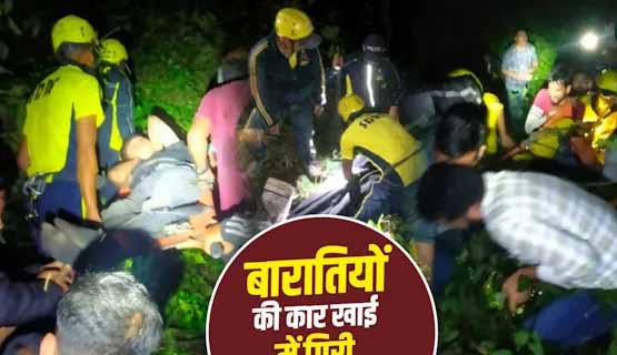 नई टिहरी। टिहरी में देर रात एक दर्दनाक सड़क हादसा हो गया। ऋषिकेश के गुमानीवाला से नरेंद्रनगर के नाई गांव जा रही बारातियों की कार खाई में गिर गई। जिससे मौके पर ही तीन युवकों की मौत हो गई। जबकि दो युवक घायल हो गए। सभी युवक श्यामपुर ऋषिकेश के बताए जा रहे हैं। घटना के बाद पुलिस, प्रशासन और एसडीआरएफ ने देर रात तक रेस्क्यू अभियान चलाया और घायलों के साथ ही शवों को भी कड़ी मशक्कत के बाद बाहर निकाला। हादसे की सूचना खाई में गिरे एक युवक ने दी।