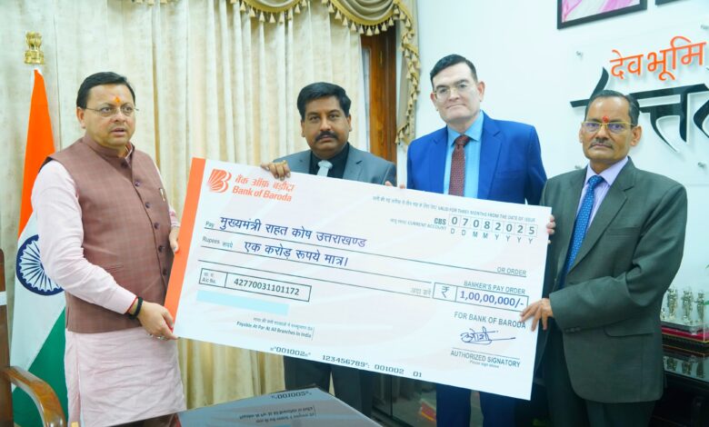 देहरादून। मुख्यमंत्री पुष्कर सिंह धामी से रविवार को मुख्यमंत्री आवास में बैंक ऑफ बड़ौदा के प्रतिनिधि मंडल ने भेंट की। इस दौरान बैंक ऑफ बड़ौदा द्वारा उत्तरकाशी जिले के धराली एवं हर्षिल क्षेत्र में आई आपदा के राहत कार्यों के लिए मुख्यमंत्री राहत कोष में घ् 1 करोड़ की धनराशि का योगदान दिया। मुख्यमंत्री ने बैंक ऑफ बड़ौदा द्वारा दिए सहयोग के लिए बैंक प्रबंधन का आभार व्यक्त किया। इस अवसर पर अपर सचिव मनमोहन मेंनाली, ऑफ बड़ौदा के जी.एम प्रतीक अग्निहोत्री, डीजीएम एस.पी.एस तोमर, रीजनल हेड अरविंद जोशी मौजूद रहे।