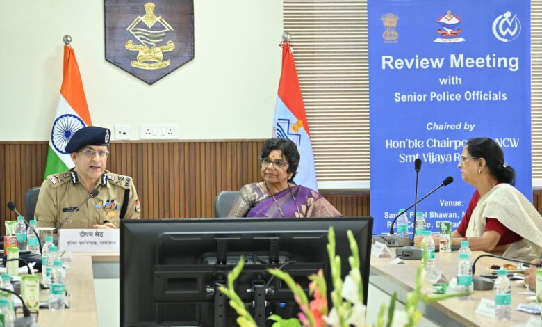 देहरादून। राष्ट्रीय महिला आयोग की अध्यक्ष विजया रहाटकर ने सरदार पटेल भवन स्थित सभागार में पुलिस महानिदेशक दीपम सेठ सहित प्रदेश के वरिष्ठ अधिकारियों के साथ एक उच्च स्तरीय समीक्षा बैठक की। बैठक में महिलाओं की सुरक्षा और समन्वित प्रयासों की समीक्षा की गई। बैठक में राज्य महिला आयोग की अध्यक्ष कुसुम कण्डवाल, अपर पुलिस महानिदेशक प्रशासन ए.पी. अंशुमान, समस्त पुलिस महानिरीक्षकगण, अन्य वरिष्ठ पुलिस अधिकारी एवं राष्ट्रीय महिला आयोग के अधिकारी उपस्थित रहे।