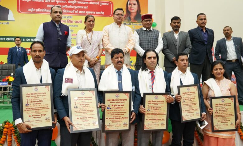 देहरादून। मुख्यमंत्री पुष्कर सिंह धामी ने शुक्रवार को देहरादून स्थित नवीन बहुद्देशीय क्रीड़ा भवन, परेड ग्राउण्ड में खेल विभाग द्वारा आयोजित कार्यक्रम में वर्ष 2019-20 के लिए बैडमिन्टन खिलाड़ी लक्ष्य सेन, वर्ष 2020-21 के लिए एथलेटिक्स खिलाड़ी चन्दन सिंह को देवभूमि उत्तराखण्ड खेल रत्न पुरस्कार से सम्मानित किया। देवभूमि उत्तराखण्ड द्रोणाचार्य पुरस्कार वर्ष 2019-20 के लिए बैडमिन्टन प्रशिक्षक धीरेन्द्र कुमार सेन, वर्ष 2020-21 के लिए ताईक्वांडो प्रशिक्षक कमलेश कुमार तिवारी, एवं वर्ष 2021-22 के लिए तीरंदाजी प्रशिक्षक संदीप कुमार डुकलान को पुरस्कार देकर सम्मानित किया गया। साथ ही खेल के क्षेत्र में उल्लेखनीय योगदान दिए जाने पर लाइफटाइम अचीवमेंट पुरस्कार वर्ष 2021-22 से एथलेटिक्स खिलाड़ी सुरेश चन्द्र पाण्डे को सम्मानित किया। इस दौरान मुख्यमंत्री पुष्कर सिंह धामी द्वारा वर्ष 2021 एवं 2022 के राष्ट्रीय स्तर के 168 पदक विजेता खिलाड़ियों एवं 42 प्रशिक्षकों को नकद पुरस्कार से सम्मानित किया। खिलाड़ियों एवं प्रशिक्षकों को कुल 2.08 करोड़ रूपये की धनराशि वितरित की गई। मुख्यमंत्री पुष्कर सिंह धामी ने कहा कि उत्तराखंड के युवा खिलाड़ी राष्ट्रीय एंव अंतरराष्ट्रीय प्रतियोगिताओं में प्रतिभाग कर एवं पदक जीतकर प्रदेश का नाम रोशन कर रहे हैं। जब कोई खिलाड़ी अन्तरराष्ट्रीय स्तर पर खेल रहा होता है, तो पूरे देश की भावनाएं उससे जुड़ी होती हैं। राज्य में खेलों को बढ़ावा देने के लिए हर सम्भव प्रयास किये जा रहे हैं। राज्य में “मुख्यमंत्री उदीयमान खिलाड़ी उन्नयन योजना“ प्रारंभ की गई है। प्रत्येक जिले के 150 बालक और 150 बालिकाओं अर्थात प्रदेश के कुल 3900 उभरते खिलाड़ियों को खेल छात्रवृत्ति दी जा रही है। सरकारी नौकरियों में खेल कोटे को भी पुनः प्रारंभ करने का निर्णय लिया गया है। नई खेल नीति में खिलाड़ियों को हर संभव सुविधा उपलब्ध कराने के प्रयास किये गये हैं। मुख्यमंत्री ने कहा कि प्रधानमंत्री नरेन्द्र मोदी जी के नेतृत्व में एक नये भारत, शक्तिशाली भारत और समृद्धशाली भारत का निर्माण हो रहा है। खेलों के क्षेत्र में भी भारत का मान सम्मान बढ़ रहा है, दुनिया में कहीं भी खेल का मैदान हो, आज भारत का तिरंगा शान से लहराता हुआ दिखता है। प्रधानमंत्री जी ने देश में खेलों को बढ़ावा देने के लिए कई नई पहलें प्रारंभ की हैं। खेलो इंडिया कार्यक्रम इसी सोच का एक सर्वश्रेष्ठ उदाहरण है। आज देश में खेल प्रतिभाओं को हर स्तर पर बढ़ावा दिया जा रहा है और उन्हें बेहतर से बेहतर ट्रेनिंग सुविधाएं उपलब्ध कराने का प्रयास किया जा रहा है। जब हम अपना लक्ष्य निर्धारित करते हैं और उस पर आगे बढ़ते हैं, तो सफलता अवश्य मिलती है। उन्होंने कहा कि 2025 तक उत्तराखण्ड क