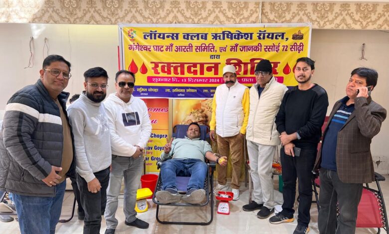 ऋषिकेश। लायंस क्लब ऋषिकेश रॉयल द्वारा गंगेश्वर घाट माँ आरती समिति एवं माँ जानकी रसोई 72 सीढ़ी तथा परिवर्तन चौरिटेबल ब्लड सेंटर के सौजन्य से एक भव्य रक्तदान शिविर का आयोजन किया गया। इस शिविर में लगभग 35 यूनिट रक्तदान किया गया। कार्यक्रम की विस्तृत जानकारी कार्यक्रम संयोजक लायन वीनीत गुलाटी एवं लायन अनुज अरोड़ा ने संयुक्त रूप से दी। उन्होंने रक्तदान के महत्व पर प्रकाश डालते हुए कहा कि रक्तदान महादान है और इससे जरूरतमंदों की जान बचाई जा सकती है।