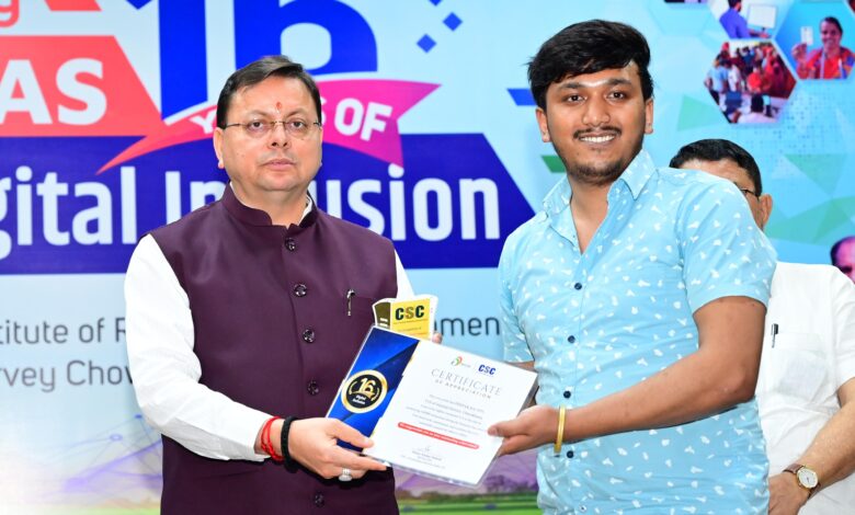 देहरादून। मुख्यमंत्री पुष्कर सिंह धामी ने शुक्रवार को आई.आर.डी.टी ऑडिटोरियम, सर्वे चैक, देहरादून में सी.एस.सी (कॉमन सर्विस सेंटर) दिवस-2025 के अवसर पर आयोजित कार्यक्रम में प्रतिभाग किया। इस दौरान उन्होंने सीएससी के क्षेत्र में उत्कृष्ट कार्य करने वाले लोगों को सीएससी वी.एल.ई पुरस्कार से भी सम्मानित किया। मुख्यमंत्री ने कहा कि सीएससी उस परिवर्तन का प्रतीक है, जो देश के कोने-कोने तक पहुंच गया है। यह आम लोगों के विश्वास का केंद्र होने के साथ-साथ लोगों की आकांक्षाओं को भी पूरा करता है। सीएससी के माध्यम से शहरों की सेवाएं एक क्लिक में गांव तक पहुंच रही हैं तथा देश की ग्राम पंचायतें डिजिटल पंचायतें बन रही हैं। उन्होंने कहा कि उत्तराखंड जैसे पहाड़ी राज्य में सीएससी की भूमिका और भी महत्वपूर्ण हो जाती है।