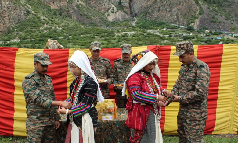 पिथौरागढ़। सीमांत गाँवों में बहनों ने सेना के जवानों की कलाई पर राखी बांधी। महिलाओं ने उन्हें रक्षक से भाई बनाया। व्यास घाटी की दुर्गम पहाड़ी गुंजी में सख्त परिस्थितियों के बीच, भारतीय सेना ने महिलाओं और बच्चों के ाथ रक्षाबंधन समारोह आयोजित किया। इस अवसर पर रंग समुदाय की बहनों ने परंपरागत तरीके से तिलक लगाकर सैनिकों का राखी बांधी। साथ ही उनकी सलामती की कामना की। बदले में जवानों ने भी बहनों को मिठाइयां, उपहार और स्नेह भरे शब्दों से सम्मानित किया। रक्षाबंधन का यह आयोजन इस बात का प्रतीक बन गया कि भारतीय सेना केवल देश की सीमाओं की नहीं बल्कि लोगों दिलों की भी रक्षा कर रही हैं।